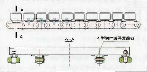 原平板輸送鏈條的結(jié)構(gòu)如圖2,鏈條由帶K型附件的滾子套筒鏈和方管鋼面板組成,鏈條傳動(dòng)時(shí),套筒沿著軸滑動(dòng),增加了功率的消耗。
